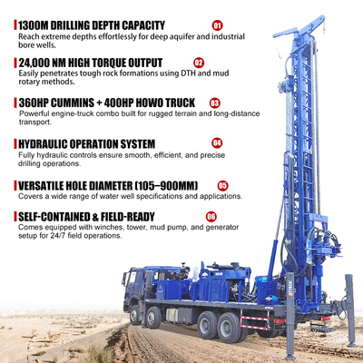 एक मजबूत 8x4 SINOTRUCK HOWO चेसिस पर घुड़सवार एक Cummins 360HP डीजल इंजन के साथ, CSD1300 को चुनौतीपूर्ण इलाकों और लंबी दूरी की स्थायित्व के लिए विशेष रूप से बनाया गया है।दूरदराज के गांवों से औद्योगिक निर्माण क्षेत्रों में, यह रिग किसी भी साइट को पूरी तरह से सुसज्जित, स्वतंत्र ड्रिलिंग स्टेशन में बदल देता है - जनरेटर सेटअप, हाइड्रोलिक-नियंत्रित टॉवर, लिंच और BW1500/12 उच्च दबाव वाले कीचड़ पंप के साथ।